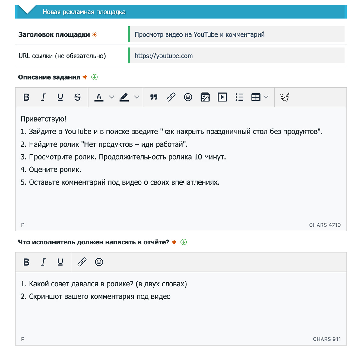 If necessary, specify the URL of the resource you want to promote. For performers, the link will automatically open in a new tab — this is convenient when they need to quickly go to the site and complete an action.
