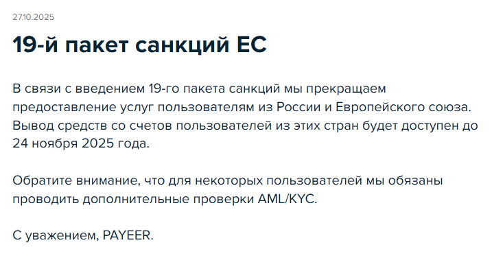 Пора начинать забывать про Payeer из-за 19-го пакета санкций Payeer заблокируют 25 ноября 2025 так что переходим на крипто кошельки.
