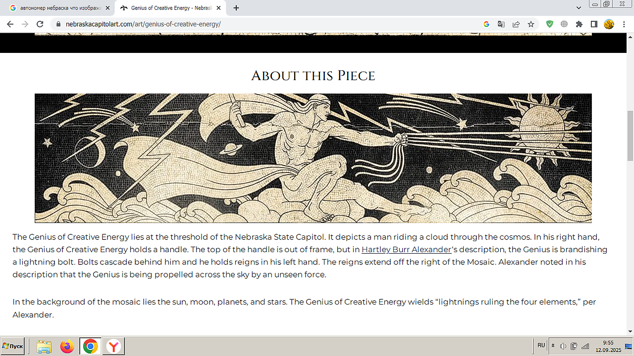 Мозаика "Гений творческой энергии" (Genius of Creative Energy) расположена на Капитолии штата Небраска и является ключевым элементом его архитектурного оформления.