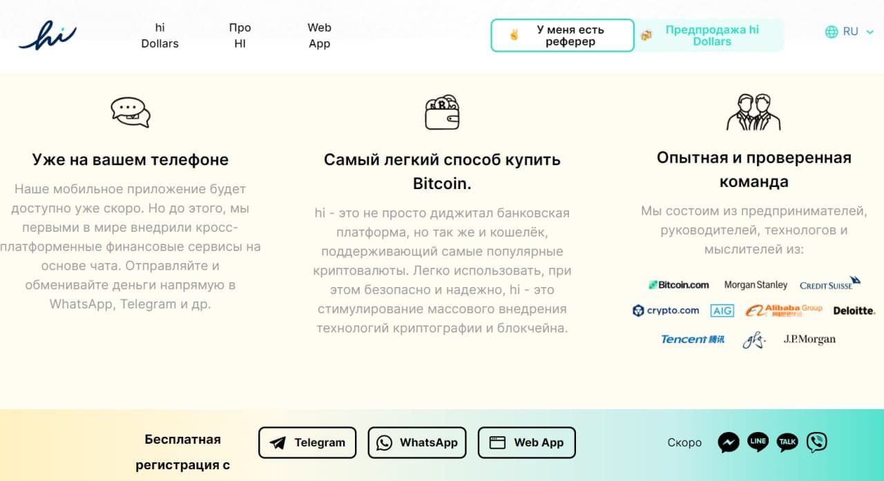 Также hi предлагает спектр услуг, аналогичных банковским, но более выгодных и быстрых (депозиты, переводы и т.п.), в том числе через популярные мессенджеры.