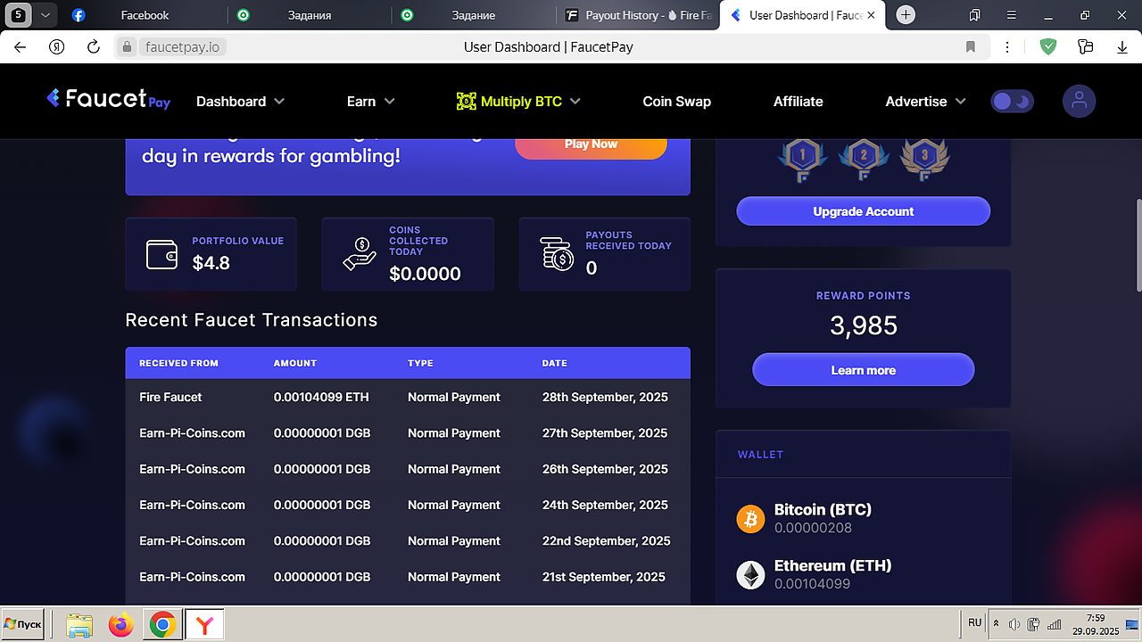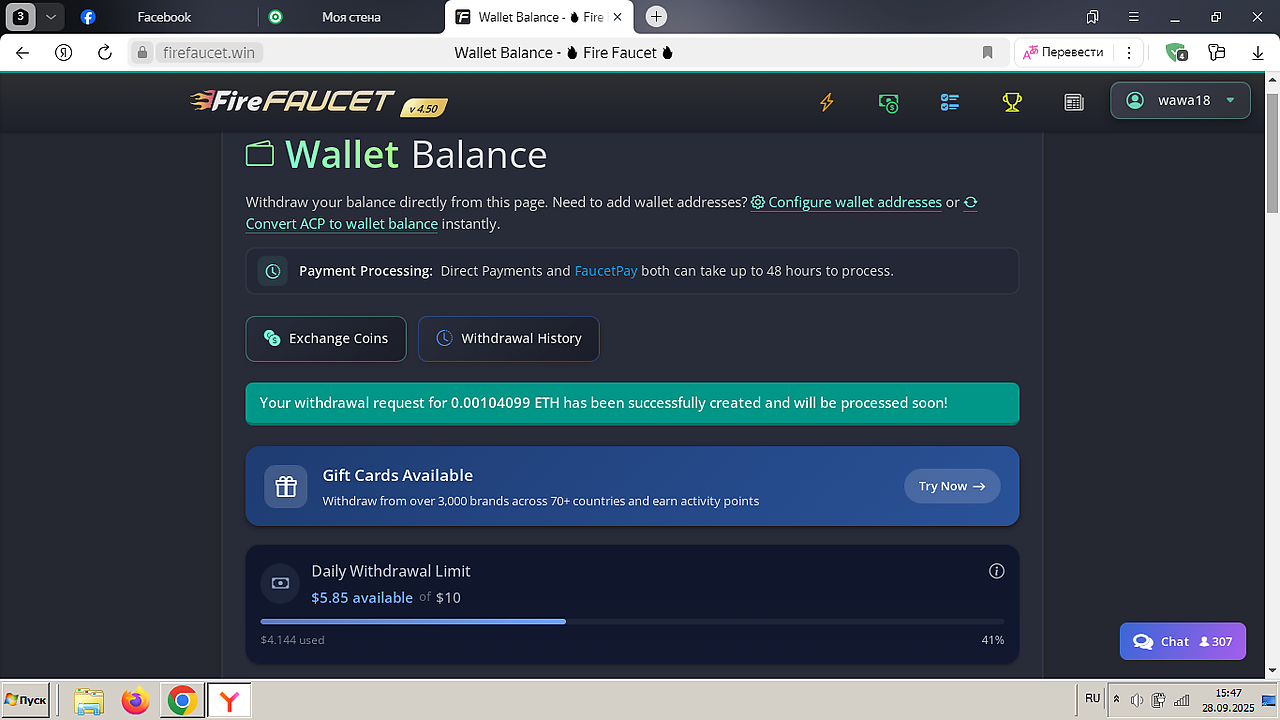 Вчера поставил на вывод 4.14 $ в Ethereum,выплата мне пришла на фаусетпей через несколько часов.