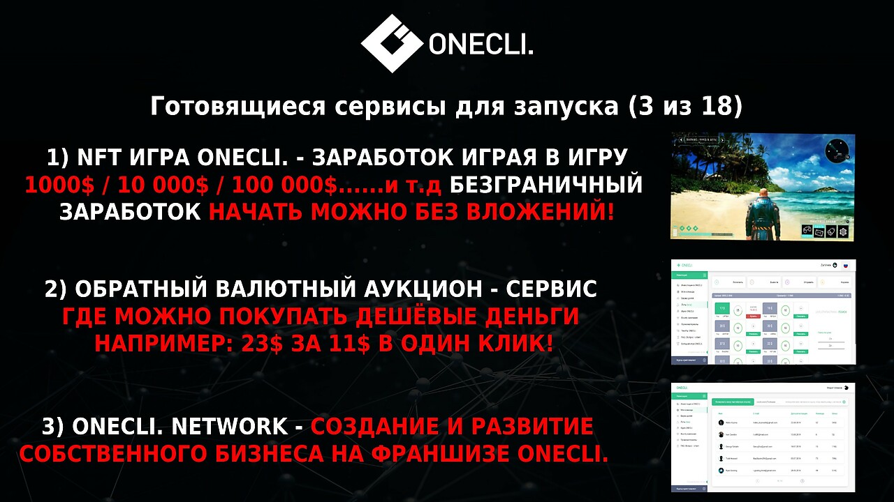 3) ONECLI. NETWORK - создание и развитие собственного бизнеса на франшизе Ванкли, где участники смогут зарабатывать партнёрский процент (%) прибыли со всех торговых сделок ваших партнеров и клиентов. ( со всех 18 сервисов с каждого клика вашего партнера ) Полный обзор экосистемы 2021 ОТ ЛИЦА ОСНОВАТЕЛЯ КОМПАНИИ - АНТОНА ВОРЖЕВА 2021 https://youtu.be/XVdHEsK_5qk
