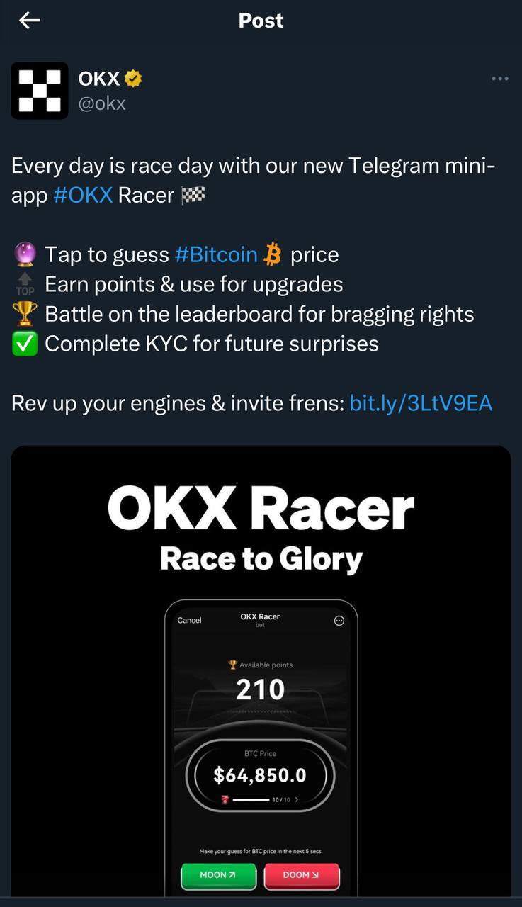 OKX Racer — новий міні-додаток у Телеграм від біржі OKX (один із найстаріших майданчиків на ринку)