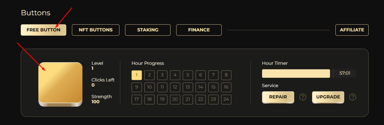 📍И потом в разделе FREE BUTTON жмем каждый час желтую большую кнопку