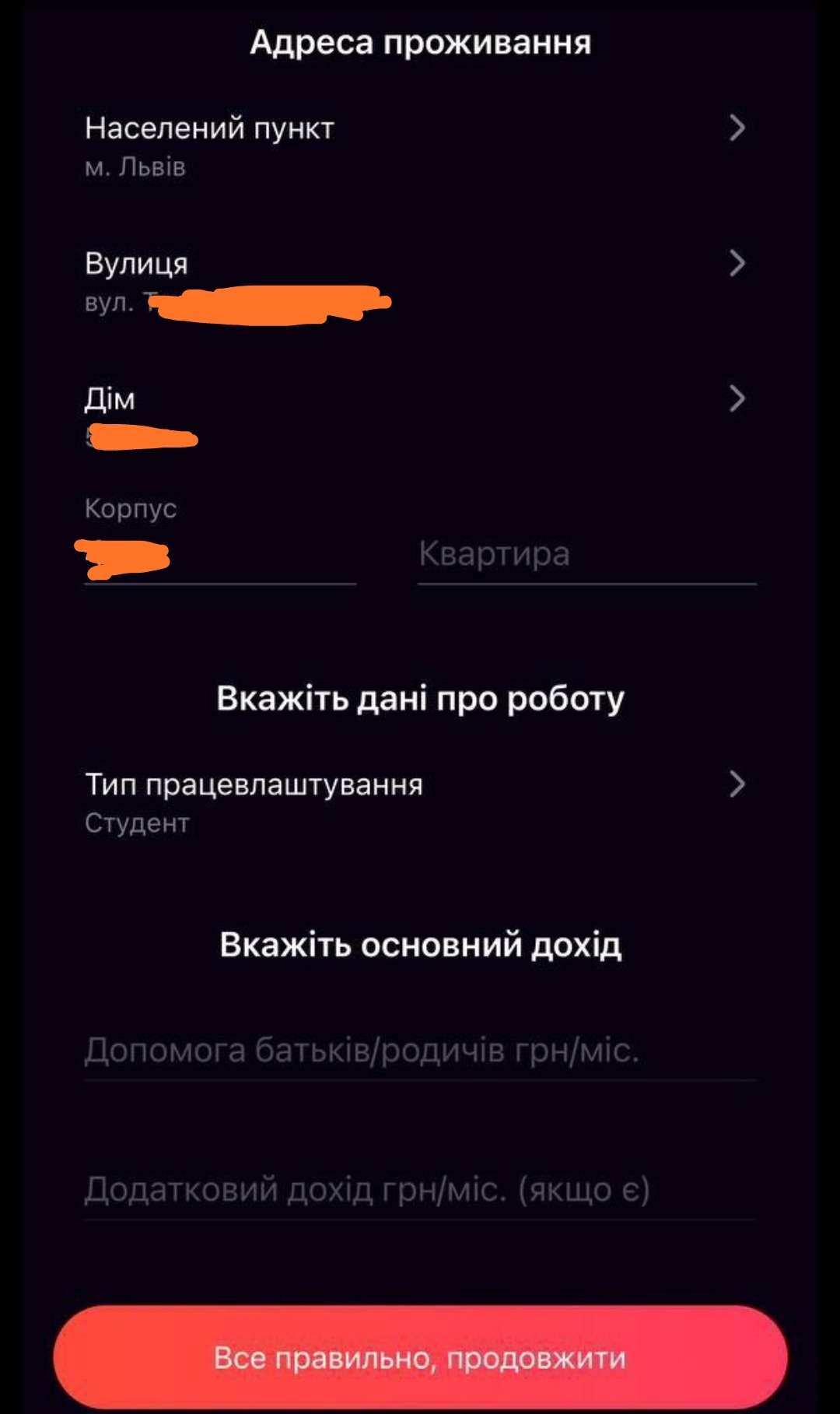 👆Пишемо свою адресу , як в паспорті , свій дохід та нажимаємо на кнопку Продовжити ✅