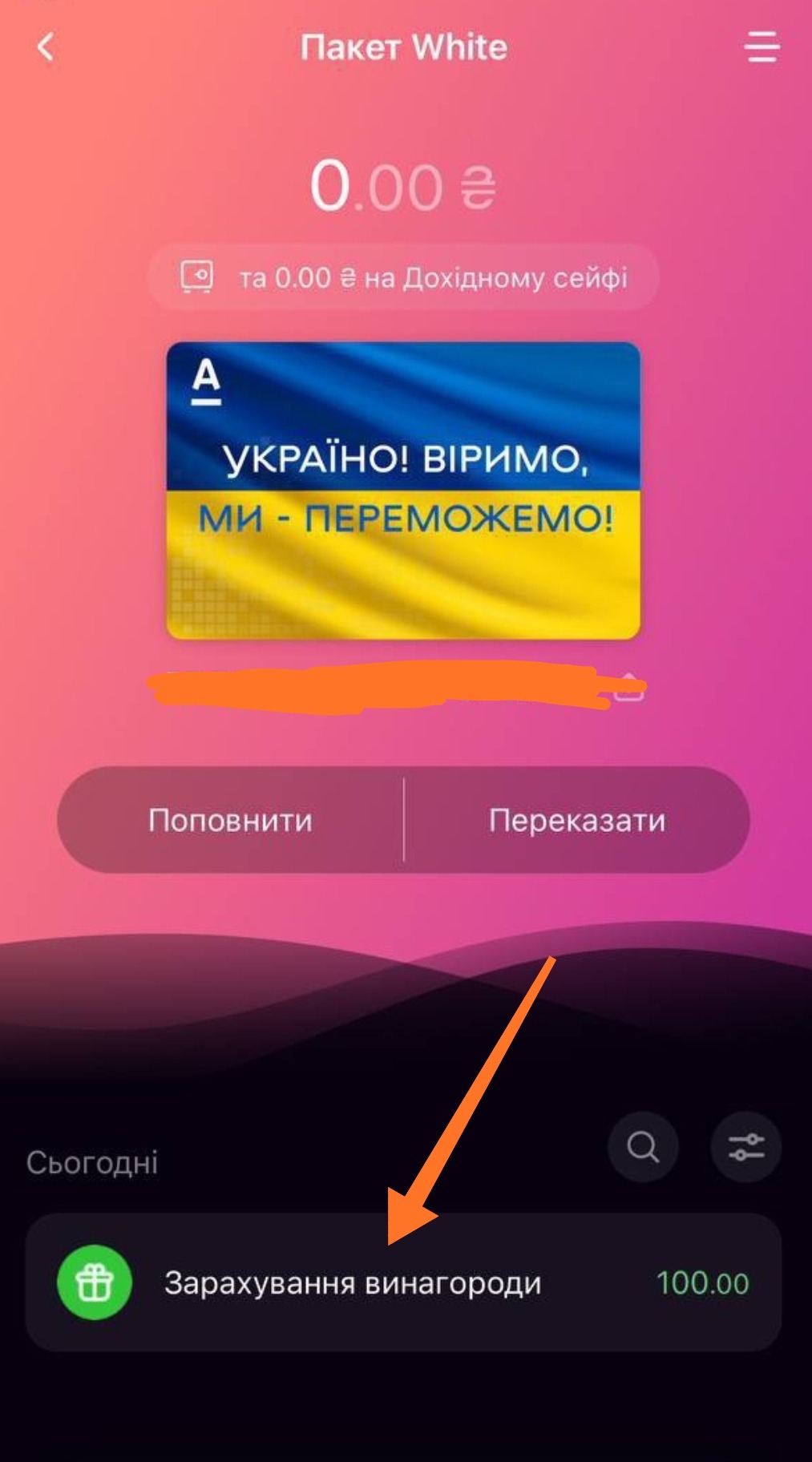 👆Вам має автоматично зарахувати 100 гривень , які будуть перераховані на вашу картку на протязі дня , ці 100 гривень ви відразу можете вивести 🤑