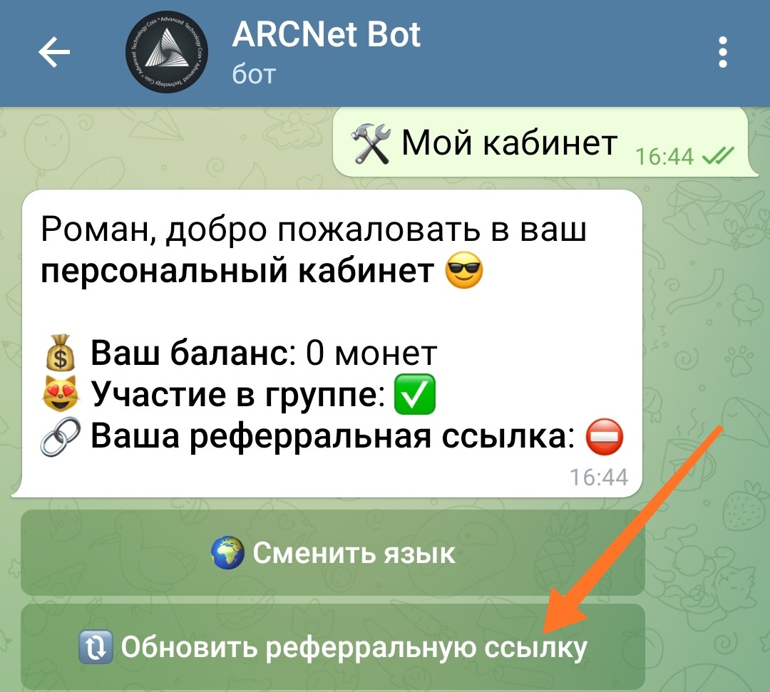 👆Знову нажимаємо на Мой кабинет і клікаємо по кнопці обновити реферальну силку 🙃