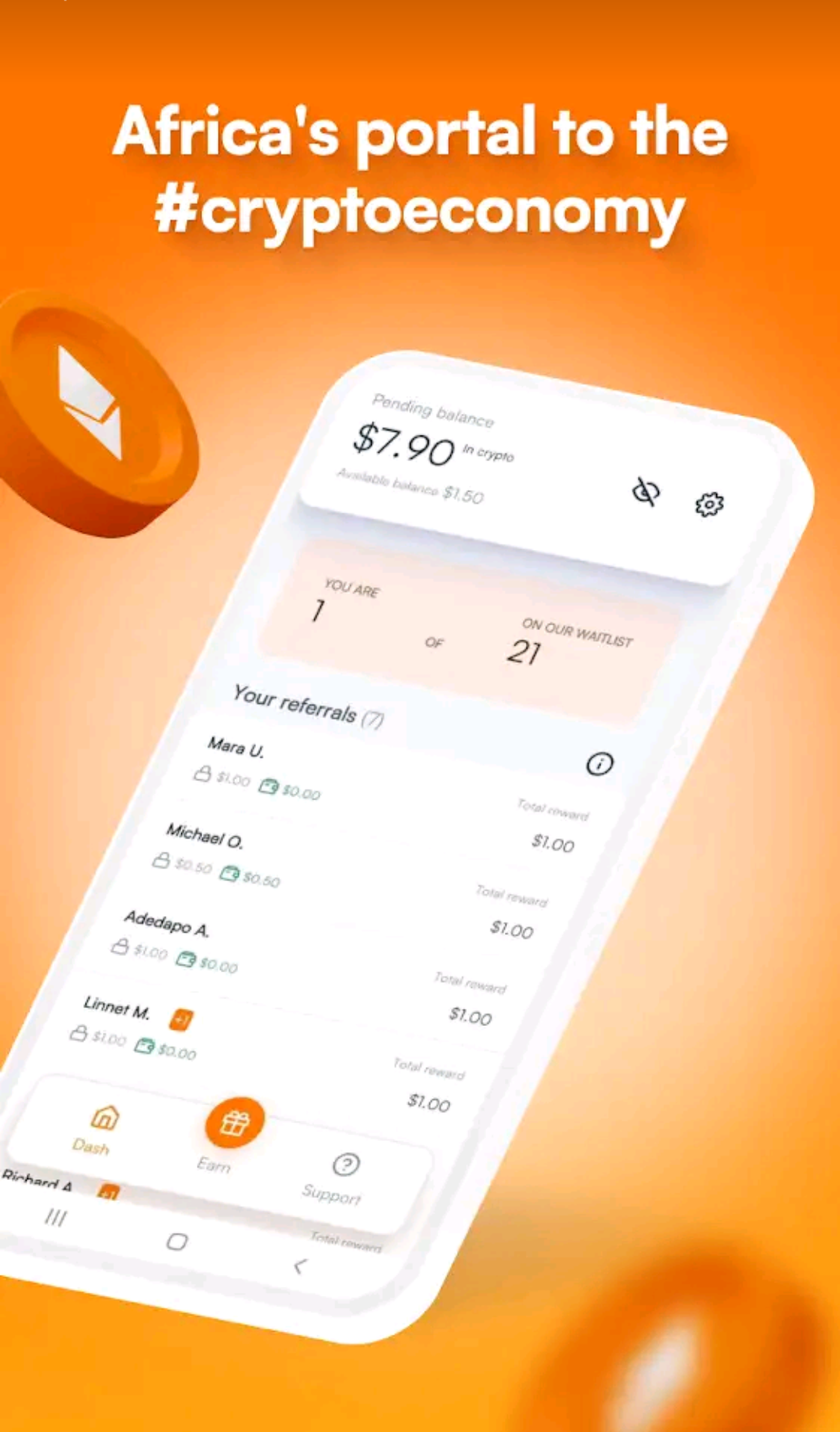 3) Отримуємо 2$ за реєстрацію та 1$ за друга, нараховують відразу, вивести можливо буде коли додаток офіційно запуститься.