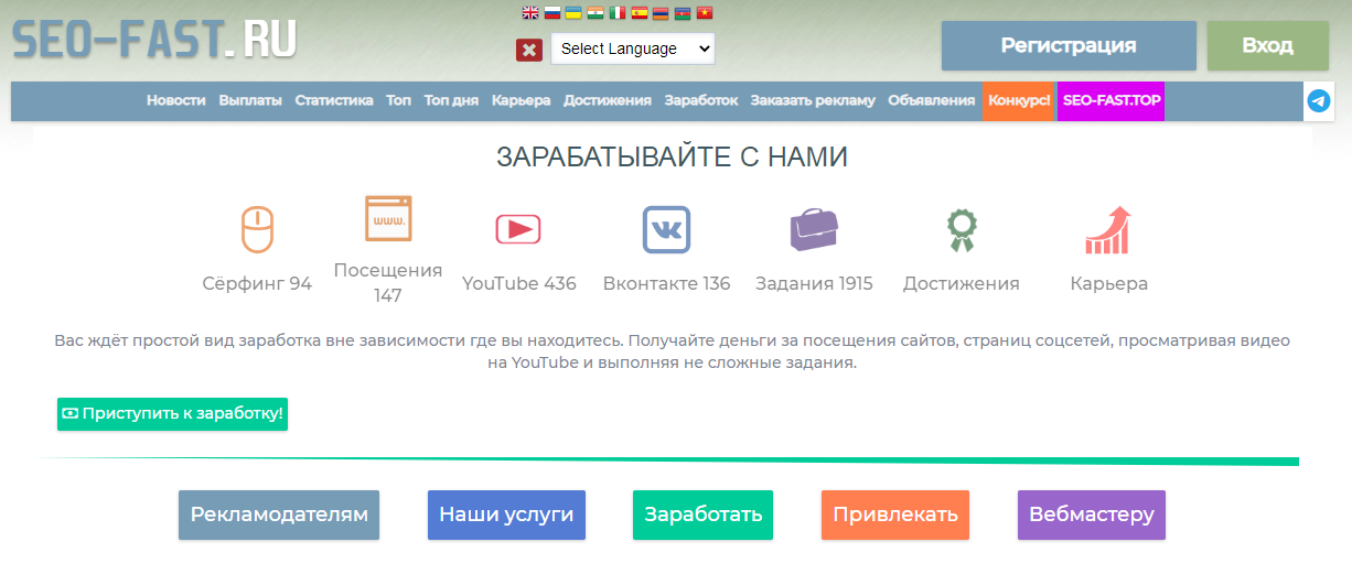 Seo-Fast — популярный сайт для заработка, функционирующий с 2012 года и объединяющий около 3 млн. пользователей. Общая сумма выплат превысила 200 000 000 ₽, что делает его одним из лидеров среди буксов. Платформа отличается стабильной работой и автоматическим выводом средств на распространённые платёжные системы.
