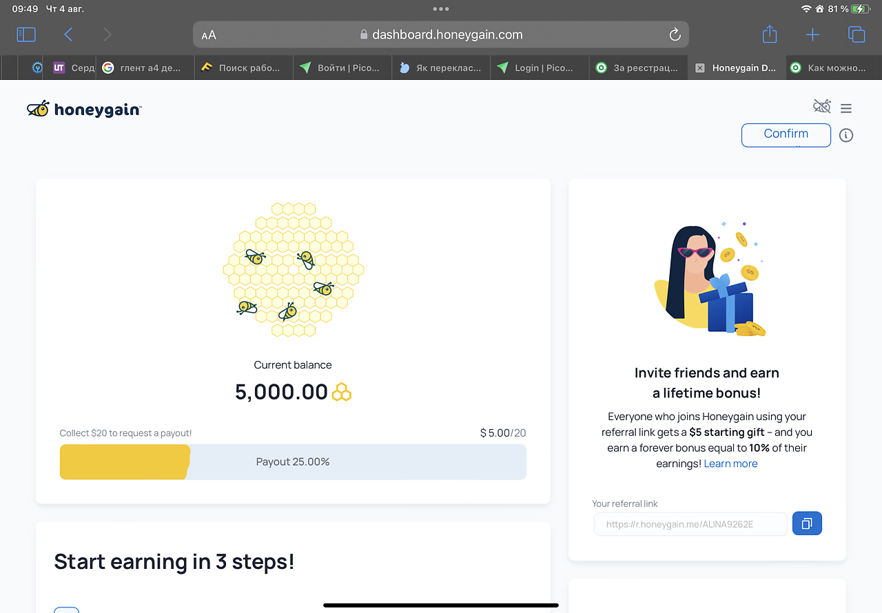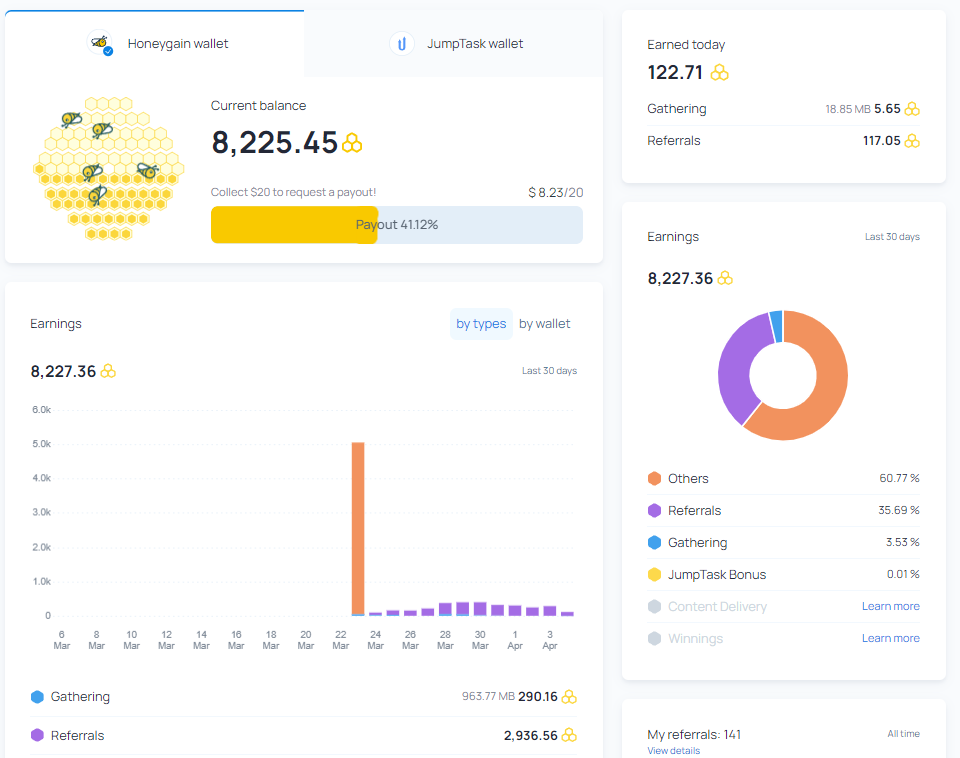 Крутий проект HoneyGain де можна заробляти без вкладень пасивно та на автоматі! Якщо коротко, то HoneyGain - це програма, яку ви встановлюєте на свій комп'ютер або смартфон на андроїд і вона використовуючи ваш доступ в інтернет, платячи вам за це гроші. За реєстрацію по ссилці https://r.honeygain.me/POPOV1F18E дають одразу 5$! Далі запрошуйте друзів! Чому? Тому що, чим більше друзів, тим швидше швидкість вашого заробітку)