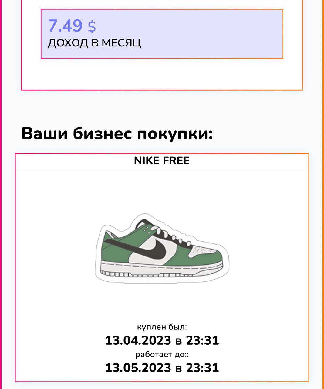 Регистрируетесь по ссылке https://uniki-m.com/i/3342 и получаете пару кроссовок, которые приносят 0.25$💰в сутки и получаете один билет, который дает шанс выиграть от 1$ до 20$💰