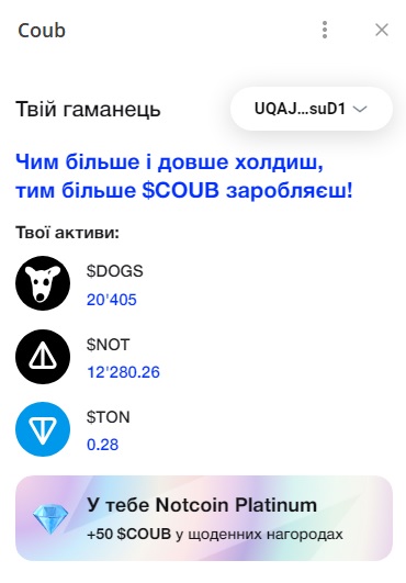 Чим більше у вас $NOT, $DOGS, $TON тим більший дроп в $COUB ви отримаєте