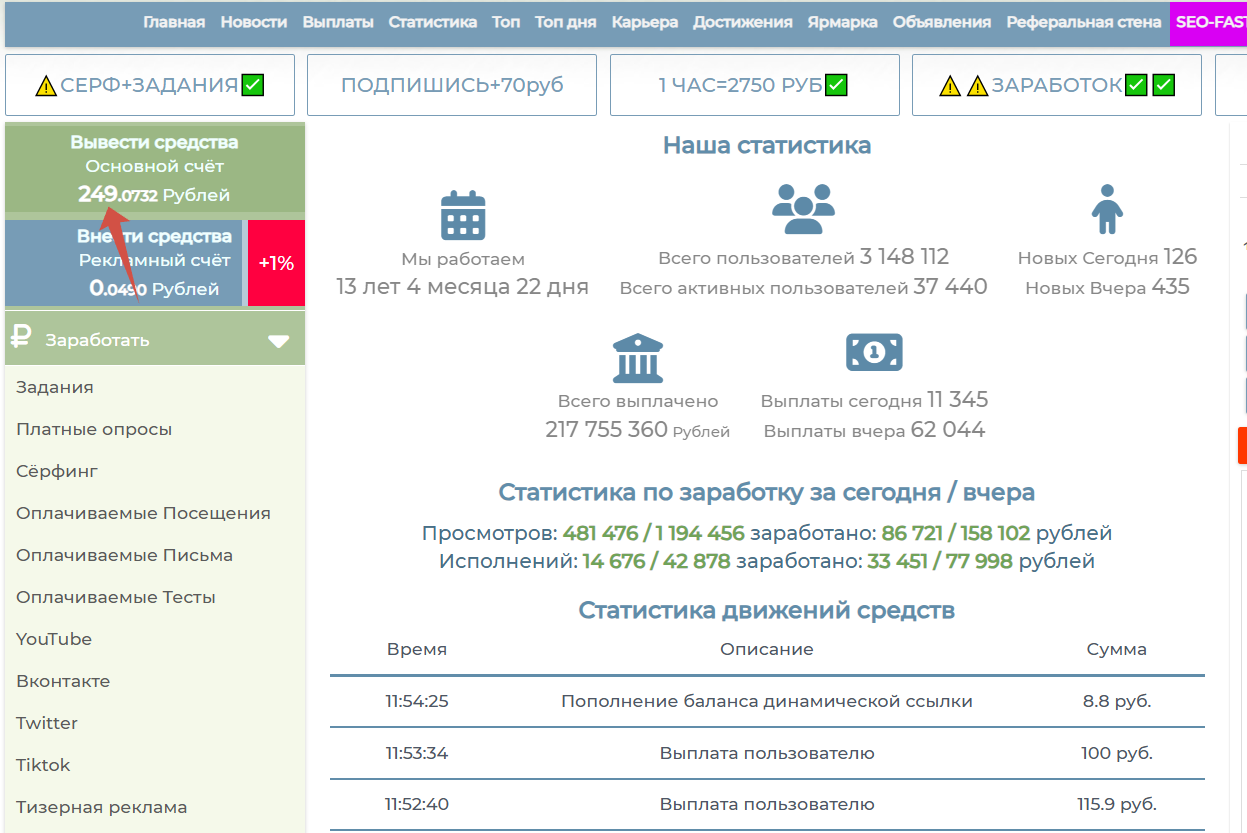 Заработок на просмотре сайтов и видео ютуб, рутуб. Начать зарабатывать очень просто. После регистрации в разделе "заработать", выбираем способ заработка. "Серфинг", это просмотр сайтов рекламодателей, за посещение которых нам платят деньги на баланс. Посмотреть сервис.